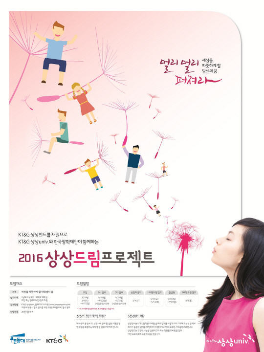 KT&G가 한국장학재단과 함께 대학생 꿈 실현 프로그램인 '2016 상상드림프로젝트'의 참가자를 오는 4월 17일까지 모집한다.
