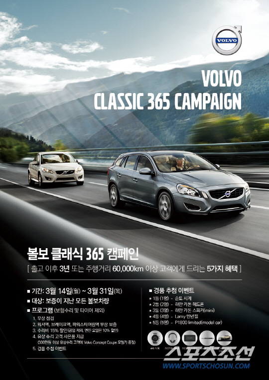 볼보자동차코리아가 14일부터 31일까지 전국 볼보자동차 공식 서비스센터에서 보증기간이 만료된 고객을 대상으로 5가지 혜택을 제공하는 '볼보 클래식 365 캠페인(Volvo Classic 365 Campaign)'을 실시한다.