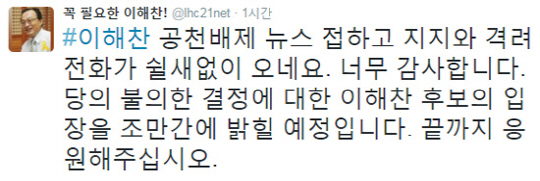 14일 이 의원 측은 공식 트위터를 통해 "공천배제 뉴스 접하고 지지와 격려 전화가 쉴 새 없이 오네요. 너무 감사합니다. 당의 불의한 결정에 대한 이해찬 후보의 입장을 조만간에 밝힐 예정입니다. 끝까지 응원해주십시오"라는 글을 게재했다.