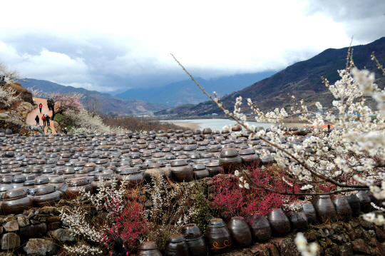도사리에서도 가장 유명한 매화밭은 12만평 규모의 청매실 농원. 봄철엔 농원이라기보다는 꽃동산에 더 가까울 만큼 풍광이 아름답다. 초입부터 청매화, 백매화, 홍매화가 다퉈 꽃망울을 터뜨려 향훈이 그윽하다. 비탈진 언덕을 따라 5분여를 오르면 큰 독이 늘어선 장독대가 맑은 하늘과 섬진강을 배경으로 늘어서 있다. 따스한 봄 햇살을 가득 받은 장독에는 매실된장, 매실고추장이 맛있게 익어가고 있다.