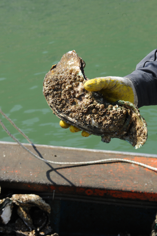 | 섬진강 광양 망덕포구 일원에서 채취한 벚굴. 크기가 어른 손바닥 보다 더 크다. |
