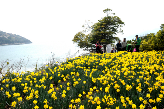3월 초부터 간간이 수줍은 듯 자태를 드러내던 수선화는 이번 주에 만개했다. 바다를 바라보며 고혹한 자태를 뽐내는 노란 수선화 군락지는 내방객들의 인기 포토 존이다.