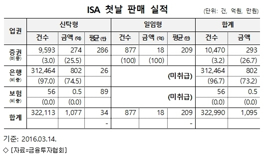 개인종합자산관리계좌(ISA)가 도입 첫날 가입자 32만2990명이 1095억원 규모로 가입한 것으로 나타났다.