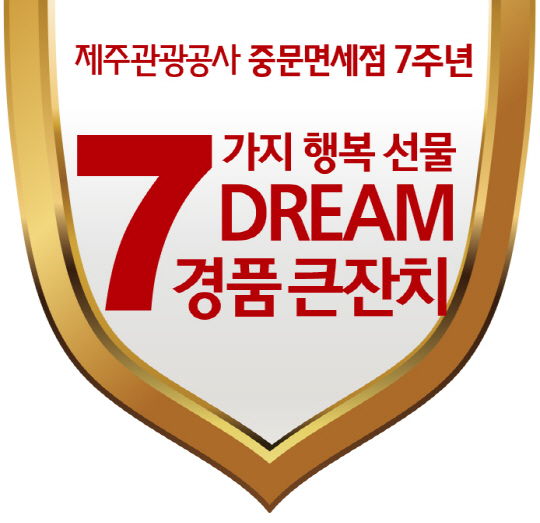 제주관광공사가 서귀포시 중문관광단지 지정면세점 개점 7주년을 기념, 특별한 경품 사은행사를 연다. 제주관광공사(사장 최갑열)는 오는 18일부터 5월22일까지 중문 매장에서 구매고객을 대상으로, 총 1000만 원 상당의 '7가지 행복선물 경품 큰잔치'를 마련한다.
