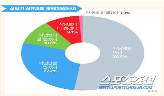 '작년만큼 뽑겠다'는 기업은 57개(27.2%), '작년보다 더 뽑겠다' 19개(9.1%), '작년보다 덜 뽑겠다' 22개(10.5%)였으며, '한 명도 안 뽑겠다'는 기업도 2개(1.0%)인 것으로 나타났다.
