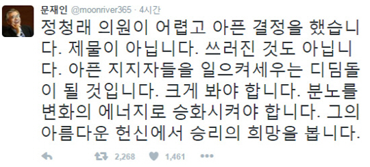 공천에서 배제된 더불어민주당 정청래 의원이 백의종군 선언을 한 가운데, 문재인 전 대표가 SNS를 통해 "아름다운 헌신"이라는 글을 올렸다.