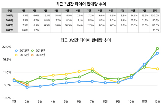 이전에는 온라인몰을 통한 일반 타이어 교체 수요가 많지 않았다. 하지만 온라인에서 타이어를 구매하면 타이어 장착점에서 직접 구매하는 것과 동일하게 서비스는 받으면서, 약 20% 저렴하게 구입 가능하다는 장점이 알려지면서 인기가 지속적으로 상승하고 있다.