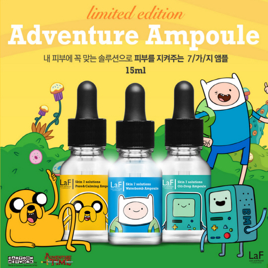 LaF 어드벤처타임 콜라보 에디션은 지난 1월 출시된 스킨 7 솔루션 앰플 30ml 7종과 베스트 셀러 앰플 3종 (워터밤, 포어앤카밍, 오일드랍) 15ml 그리고 퐁듀 치즈크림으로 구성된다.