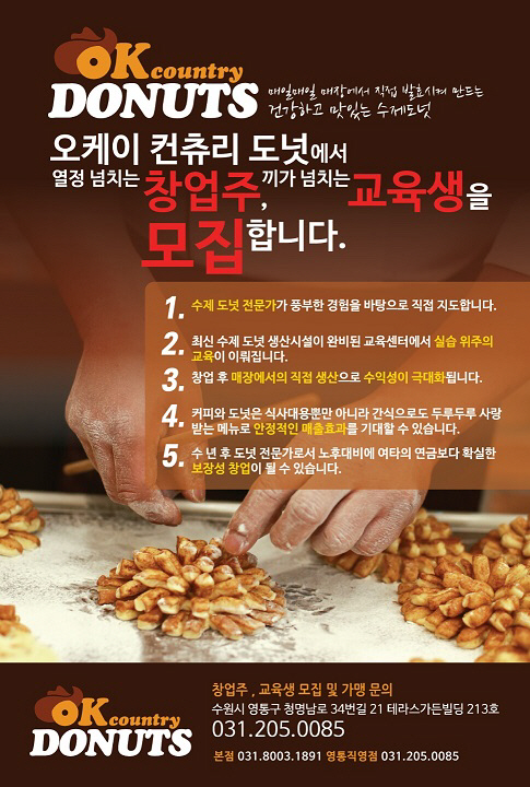 수제 도넛전문점 OK(오케이)컨츄리도넛이 24일 창업주와 교육생 모집에 나선다고 밝혔다.