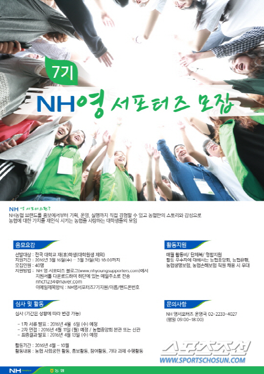 농협은 이들에게 매월 활동비를 지원하고 활동 우수자에게는 농협중앙회와 농협은행, 농협생명보험, 농협손해보험 채용 시 우대한다. 보다 자세한 내용은 NH 영 서포터즈 운영국(02-2233-4207)으로 하면 된다.
