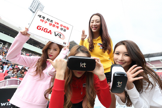 KT가 VR을 통한 가상현실 시대를 열고 있다. 28일 KT에 따르면 4월 5일부터 8일까지 kt wiz의 2016년 정규시즌 홈 개막 시리즈에서 스마트폰과 HMD를 통하여 감상 가능한 'GiGA VR' 야구 생중계에 나설 예정이다. 해당일에 수원 KT 위즈파크를 방문하는 관중에게는 카드 보드형 VR기기가 무료로 제공되며 '올레 tv 모바일' 앱과 kt wiz 공식 앱 'Wizzap'에 접속하여 GiGA VR 생중계를 시청할 수 있다.
