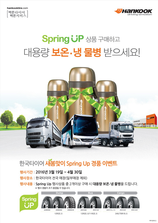 한국타이어가 트럭버스용 타이어 구매 고객을 대상으로 '새 봄맞이 스프링 업(Spring Up) 경품 이벤트'를 4월 30일까지 시행한다.