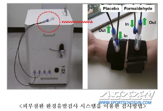 연구팀은 안전성평가연구소 흡입독성연구센터와 공동개발한 '환경유발검사 시스템'을 이용해 피검자의 피부에 폼알데히드와 깨끗한 공기를 노출시켜 반응 정도를 살폈다.