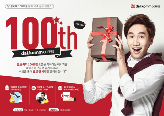 달콤커피는 이번에 부산광복점의 100호 가맹점 오픈을 기념해 이광수 팬사인회 등 다양한 이벤트를 진행한다. 또한 달콤커피는 4월 1일부터 17일까지 페이스북 댓글에 축하메시지를 남기면 추첨을 통해 선정된 2명(4장)에게 싱가폴과 대만여행 항공권을 증정한다. 또한 이광수 팬사인회 초대권(30명), 아메리카노 무료이용권(100명) 등을 증정할 예정이다.