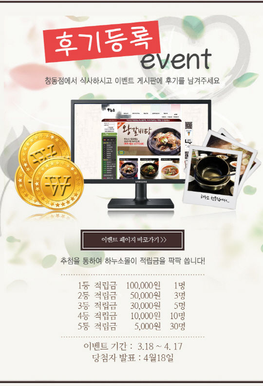 하누소가 30일 창동본점 방문 고객들을 위한 '후기등록 이벤트'를 진행한다고 밝혔다. 하누소에 따르면 4월 17일까지 홈페이지 이벤트 게시판에 하누소 창동본점에서 식사한 후기를 남기는 고객들에게 중 추첨을 통해 하누소몰 적립금을 지급한다. 1등 1명에게는 적립금 10만원, 2등 3명에게는 5만원, 3등 5명에게는 3만원, 4등 10명에게는 1만원, 5등 30명에게는 5000원의 하누소몰 적립금을 제공한다. 이벤트 당첨자 발표는 4월 18일로 예정돼 있다.
