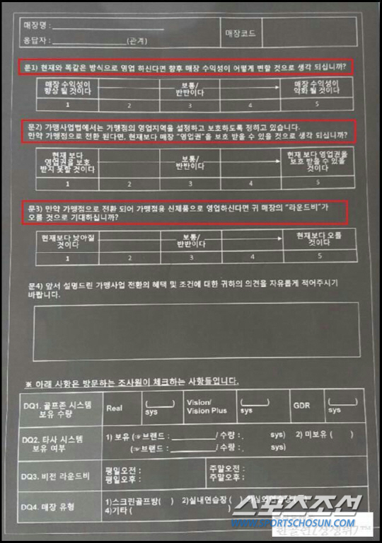그러나 전골협 측은 "당시 간담회는 회원이 2000여명에 이르는 본 조합에 대해 골프존 측에서 단지 2명만 참석하라고 요구해 불참한 것이고, 설문은 질문 자체가 가맹사업화를 전제로 한 것이라 거부한 것"이라고 반박했다. 본지에서 입수한 설문지<사진>에 따르면 업주들의 의견 개진보다 가맹점 사업으로의 유도성 질문으로 해석될 여지가 있는 것으로 업계 관계자들은 보고 있다.