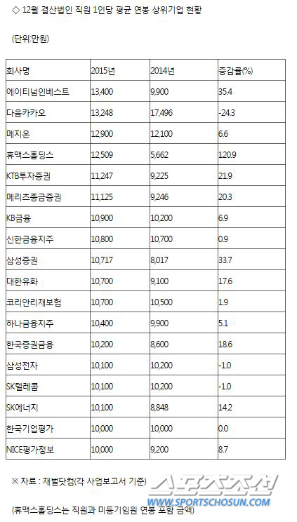 다음커뮤니케이션과 합병한 카카오는 지난해 평균 연봉이 1억3200만원으로 전년도 1위에서 2위로 밀렸다. 3위는 제약업체인 메지온(1억2900만원), 4위는 셋톱박스 전문업체인 휴맥스홀딩스(1억2509만원)가 차지한 것으로 조사됐다.