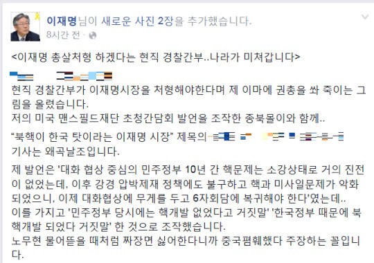 이재명 성남시장이 "이재명 성남시장을 처형시켜야 한다"는 게시물을 현직 경찰 간부가 자신의 SNS(소셜네트워크서비스)에 공유한 것과 관련해 해당 경찰관 문책과 경찰청장 공개사과 등 엄중한 조치를 요구했다.