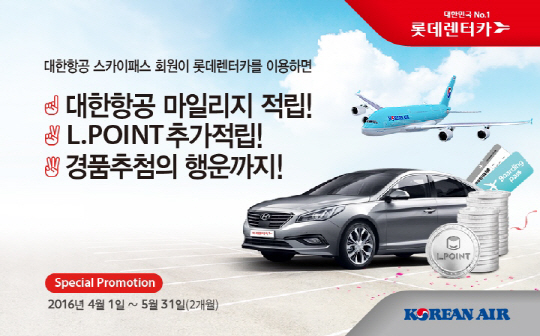 롯데렌터카는 대한항공과 마일리지 적립 제휴를 기념해 5월말까지 다양한 공동 프로모션을 진행한다고 1일 밝혔다.