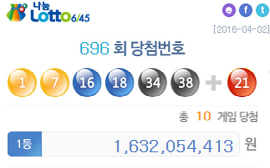 나눔로또는 2일 제696회 로또복권 추첨에서 '1, 7, 16, 18, 34, 38'이 1등 당첨번호로 뽑혔다고 밝혔다.