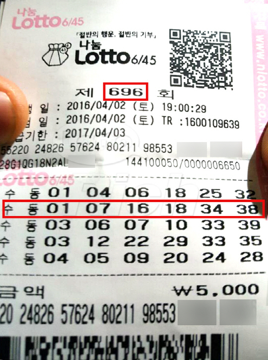 한편, 제696회 로또복권 1등 번호는 '1, 7, 16, 18, 34, 38'이며, 2등 보너스 번호는 '21'이다.