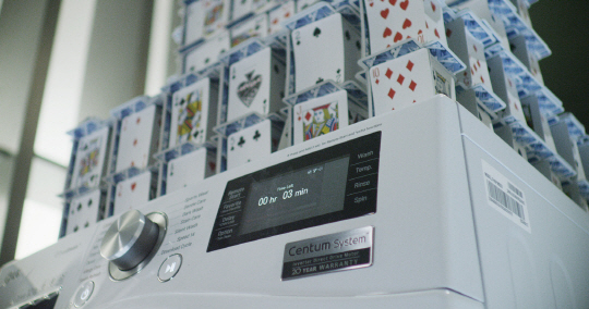 LG전자가 돌고 있는 드럼세탁기에 3.3M 카드탑을 세워 기네스북에 올랐다. LG전자의 카드탑 쌓기 이색 도전은 진동이 없는 세계 최고 수준의 내구성을 입증하기 위해 기획됐다.