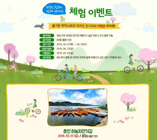 한국관광공사(사장 정창수)는 봄 '여행주간'을 맞아 국내 거주 외국인에게 '아름다운 자전거 여행길'을 소개하고 체험할 수 있는 기회를 제공하기 위해 전철로 떠나는 자전거여행 체험 이벤트 '외국인 친구와의 여행을 부탁해!'를 진행한다.