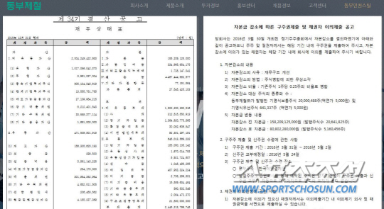 금융감독원 전자공시시스템에 따르면 동부제철은 지난해 매출 2조3200억원으로 2015년 3조240억원 대비 23.3% 줄었고, 당기순손실도 480억원으로 사실상 적자 상태다. 자본총액도 2013년 말 1조3267억원에서 2014년 말 695억원, 지난해 말에는 34억원으로 급격히 감소했다. 완전자본잠식은 면했지만 2년 연속으로 자본잠식률이 50%를 상회하는 상황이다. 동부제철의 자본잠식률은 2014년 81.3%, 2015년 97.8%에 달한다.