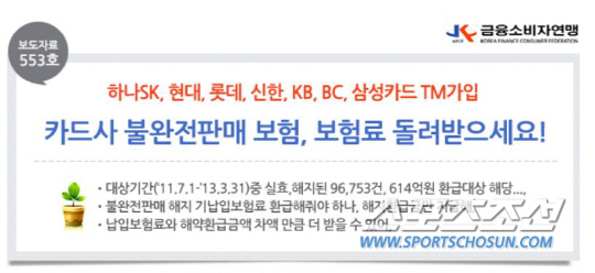 이기욱 금융소비자연맹 사무처장은 "신용카드사 보험대리점을 통해 보험을 가입하고 대상기간에 계약을 해지하거나 실효된 경우 해당보험사에 문의해서 반드시 보험료를 환급받아 소비자의 권리를 찾아야 한다"고 말했다.