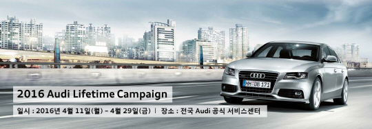 아우디 코리아는 오는 29일까지 3주간 만 4년 이상(2012년 4월 11일 이전 등록)의 아우디 차량을 소유한 고객을 대상으로 차량에 대한 이상 유무를 점검하고 안전운행을 위한 '2016 아우디 라이프타임 캠페인(2016 Audi Lifetime Campaign)'을 실시한다.