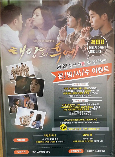 서래갈매기가 KBS드라마 '태양의 후예'의 효과를 톡톡히 보고 있다. 4월 6일 방영된 태양의 후예 13회에서는 드라마 주인공들이 서래갈매기 회기점에서 식사하는 모습이 연출됐다.