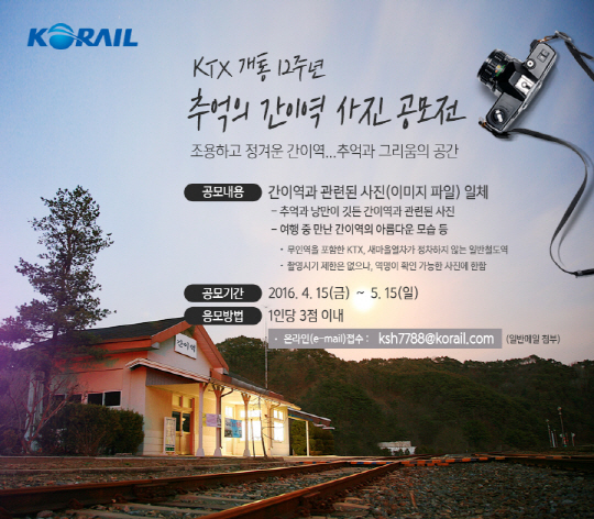 코레일이 간이역의 정취와 낭만을 되새길 수 있는 '추억의 간이역 사진 공모전'을 오는 15일부터 한 달간 개최한다. 이번 공모전은 간이역을 배경으로 한 추억이 묻어나는 사진이나, 여행 중 만난 아름다운 시골 간이역의 모습 등 전국의 간이역을 대상으로 한 자유주제의 사진으로 참여할 수 있다.