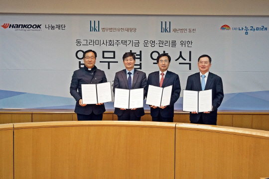 한국타이어는 사단법인 나눔과미래, 법무법인 태평양, 재단법인 동천과 사회적 취약계층의 주거 안정을 목표로 하는 '동그라미 사회주택기금'의 운영·관리를 위한 업무협약(MOU)을 체결했다.