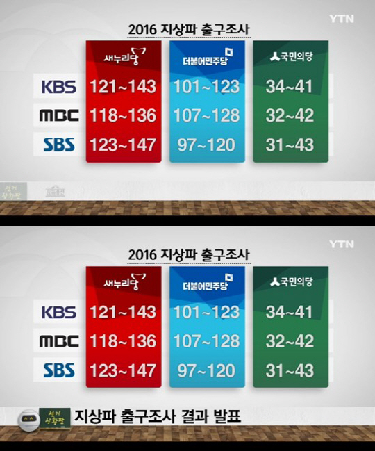 먼저 KBS 출구조사에서는 새누리당은 최저 121석에서 143석으로, 더불어 민주당은 101에서 123석, 국민의당이 34에서 41석 가량을 획득할 것으로 예측했다.