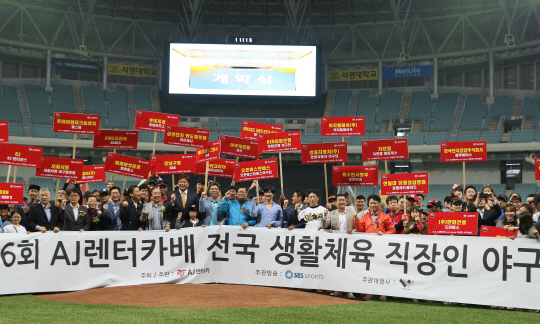 AJ렌터카가 16일 서울 고척스카이돔에서 제6회 직장인야구대회 개막전을 갖고 아마추어 최강 야구팀을 가리기 위한 대회 시작을 알렸다. 이날 진행된 개막행사에는 약 2000명의 야구팬이 방문해 뜨거운 관심을 보였다. 대회는 역대 최대인 96개팀 토너먼트로 약 90일간 진행된다.