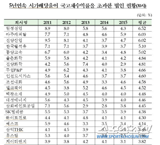 SK텔레콤과 하이트진로 등 30사는 5년 연속으로 국고채 수익률(초과수익률 1.83%포인트)을 초과하는 기록을 세웠다.