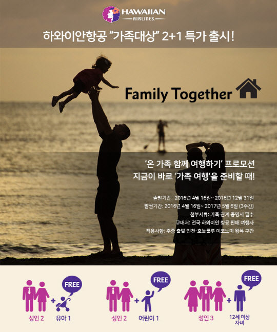 하와이안항공이 자녀와 함께 하와이 여행을 계획 중인 가족 여행객을 위해 성인 항공권 2매 구입 시 동반 자녀 1인 무료 항공권을 제공하는 '2+1 프로모션'을 실시한다.