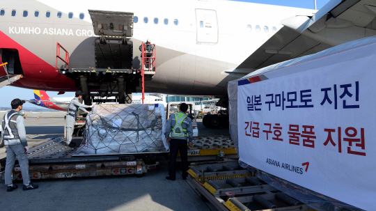 아시아나항공이 지진으로 피해를 입은 일본 구마모토 재난지역 주민들을 돕기 위해 재난구호 성금 1억원과 긴급구호 물품을 기부했다고 19일 밝혔다. 아시아나항공은 19일 인천~후쿠오카를 운항하는 OZ132편에 기내 담요 1000장 등을 탑재해, 구마모토 지진 피해지역으로 긴급 수송했다.