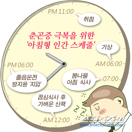 춘곤증은 겨우내 움츠렸던 인체가 따뜻한 봄 날씨에 적응하는 과정에서 나타나는 일종의 피로이다. 피부 온도가 올라가고 근육이 이완되면서 나른한 느낌을 갖는 것이다. 해 뜨는 시간이 빨라지는 봄에 적응하려면 일찍 자고 일찍 일어나야 한다. 19일 서울 기준 해뜨는 시간은 오전 5시52분이다. 해가 뜬 이후에는 어차피 깊은 잠을 자기가 어렵다. 일찍 일어나는 사람이 춘곤증을 잡는다.