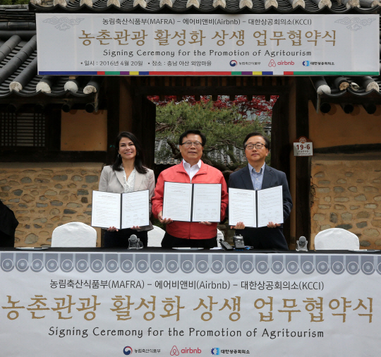 대한상공회의소와 농림축산식품부·에어비앤비는 20일 오전 충남아산 외암민속마을에서 '농촌관광 활성화 상생업무 협약'을 체결했다.
