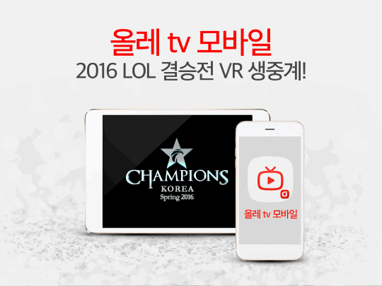 KT가 세계 최초로 e스포츠 'LoL 챔피언스 코리아 스프링 2016' 결승전을 올레tv모바일에서 VR 생중계한다고 21일 밝혔다. KT는 CJ E&M과 제휴하여 23일 잠실 체조경기장에서 열리는 'LoL 챔피언스 코리아 스프링 2016' 결승전을 VR생중계로 제공 할 예정이다.