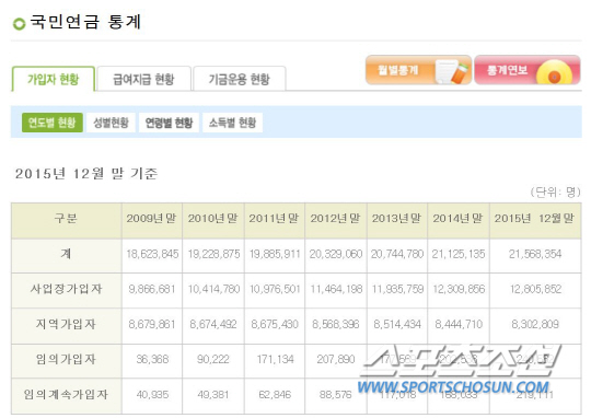 21일 국민연금공단에 따르면 2015년 12월 말 기준 임의가입자 수는 24만6558명으로 전년대비 약 4만명 정도가 늘었다. 국민연금 임의가입자는 2009년 3만6368명에서 2010년 9만222명으로 급격하게 증가했다. 이듬해인 2011년에는 17만1134명으로 2배 가까이 치솟았다. 2012년에는 20만7890명으로 처음 20만명 선을 넘어섰다.
