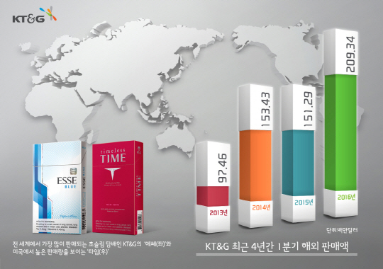 KT&G의 올해 1분기 해외 매출액이 사상 처음으로 2억 달러(약 2270억원)를 돌파하며, 분기 최고치를 기록한 것으로 나타났다.