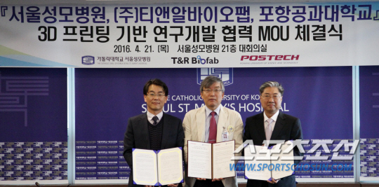 가톨릭대학교 서울성모병원(병원장 승기배 교수)은 21일 병원 본관 21층 VIP회의실에서 포스텍(총장 김도연), (주)티앤알바이오팹(대표이사 윤원수)과 3D 프린팅 기반 연구개발 협력을 위한 양해각서(MOU)를 체결했다고 밝혔다.
