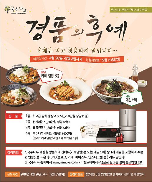 이벤트 응모는 국수나무 매장을 방문해 신메뉴를 포함한 식사 후 인증샷 또는 후기를 블로그, 페이스북, 인스타그램 등 개인 SNS에 리뷰를 남기면 된다.