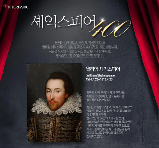 인터파크도서가 셰익스피어의 주요 명작을 모아 '셰익스피어 400' 기획전을 진행한다.
