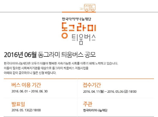 한국타이어는 나눔재단에서 시행하는 '동그라미 틔움버스' 6월 공모를 5월 6일까지 접수 받는다.
