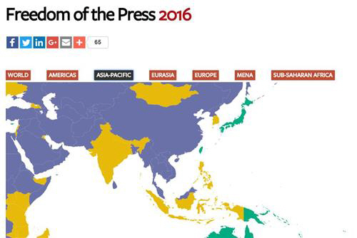 올해 조사 대상 국가 중 '언론 자유국'은 62개였고 '부분적 언론자유국'은 71개, '자유롭지 못한 나라'는 66개였다.