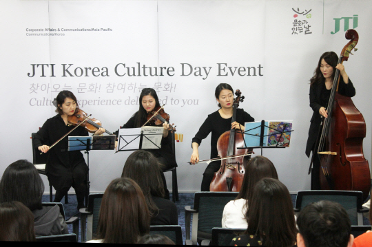 글로벌 담배기업 JTI코리아는 지난 27일 정부 주도의 문화가 있는 날에 적극 참여하고 임직원들의 문화 생활을 장려하기 위해 현악 4중주 팀을 초청해 사내 '음악회'를 개최했다고 밝혔다.