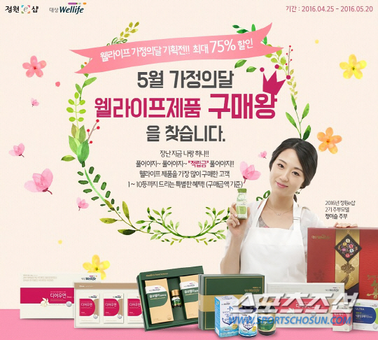 가정의 달 5월을 맞아 대상의 통합 온라인몰 정원e샵(www.jungoneshop.com)은 다음 달 20일까지 웰라이프 제품을 최대 75%까지 할인 판매하는 '웰라이프 가정의 달 기획전'과 '웰라이프제품 구매왕을 찾습니다' 이벤트를 대대적으로 진행한다고 28일 밝혔다.